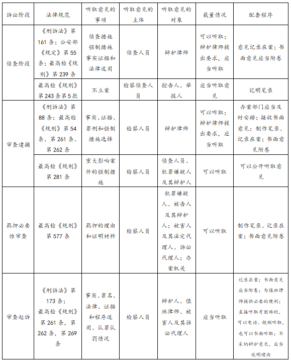 首先,听取意见规则的生成,应当遵循合目的性原则,将保障辩方的权利作为听取意见式司法的核心目标,重视辩方“表达意见”权的制度保障。例如,应当明确诉讼参与人尤其是辩护律师和被追诉人的表达意见权,赋予其开启听取意见程序的主动权。