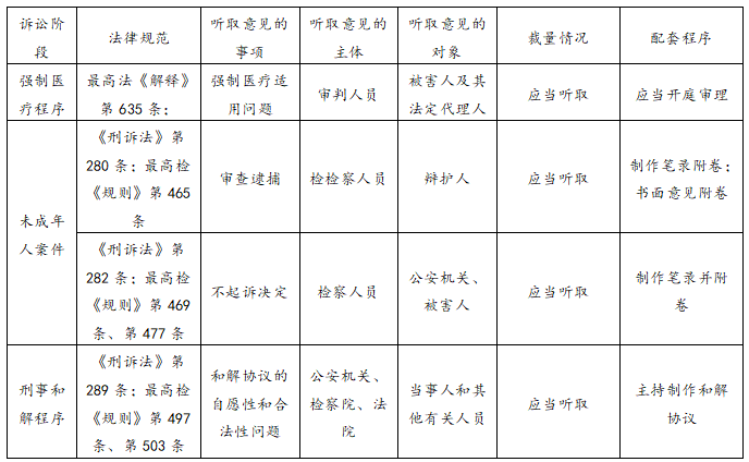 其三,听取意见式司法不同于“刑事听证”。从“刑事听证”的实践来看,相较于庭审,“刑事听证”的对抗性较弱,在诉讼构造上更为开放,在参与主体上也更为广泛,“听证”的地点也不必拘泥于法庭;而听取意见式司法的程序构造虽然不局限于控辩裁三方,向被害人等开放,但无论是启动的条件还是程序进行的条件都比刑事听证更为灵活。