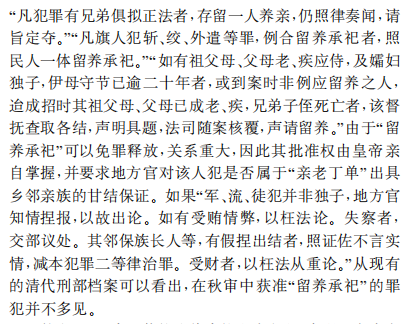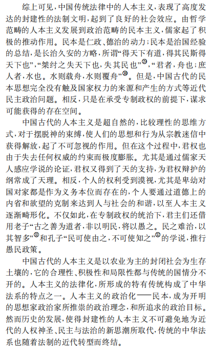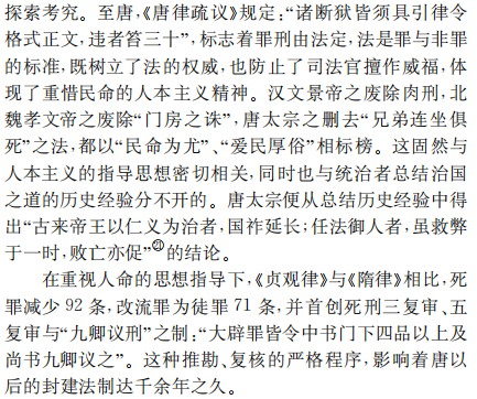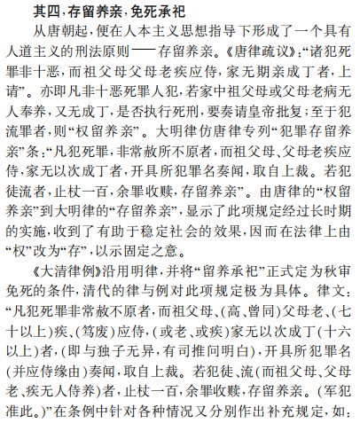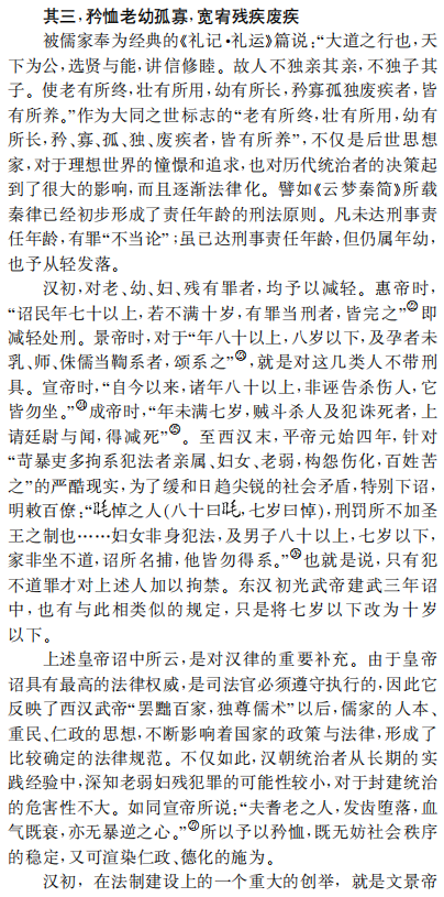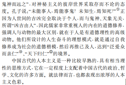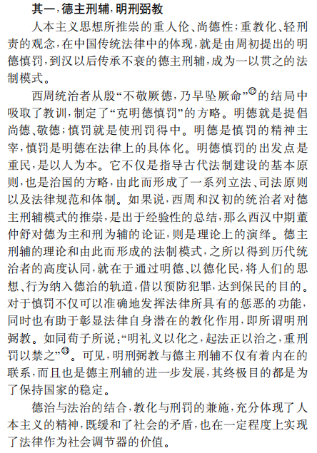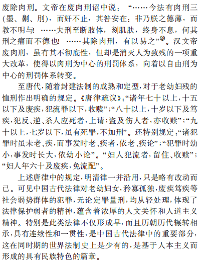 摘要:中国古代的人本主义是一种比较早熟中的、具有相当理性的思维方式,它在一定程度上支配着中国古代的政治、哲学、文化的许多方面。就法律而言,也就表现出浓厚的人本主义色彩:其一,德主刑辅,明刑弼教;其二,援法断罪,重惜民命;其三,矜恤老幼孤寡,宽宥残疾废疾;其四,存留养亲,免死承祀。