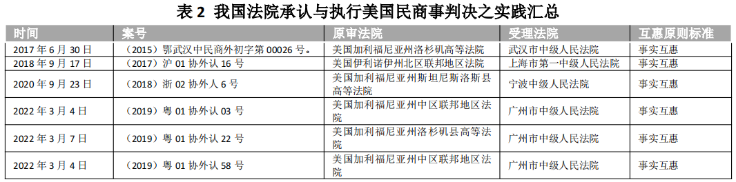 2016年,南京市中级人民法院在高尔集团股份有限公司与江苏省纺织工业(集团)进出口有限公司申请承认与执行外国法院民事判决纠纷案中(以下简称高尔集团案),以新加坡存在承认中国法院判决的先例为依据,认定中国与新加坡之间存在互惠关系,可谓是采取事实互惠第一案。这意味着中国法院不再以双方之间共同参加的条约为唯一判断依据,而是审查请求国是否存在承认中国法院判决的先例,如果存在承认先例,则认为中国与请求国之间存在互惠关系。受此案影响,中美相互承认与执行判决迎来了转机。2017年6月,武汉市中级人民法院在刘利诉陶莉等一案(以下简称“刘利案”)中,以2010年的葛洲坝三联案为肯定性事实,首次承认并执行美国加利福尼亚州洛杉矶县高等法院第EC062608号判决。武汉市中级人民法院认为,由于美国已经存在承认中国判决的先例,中国方面也应该投桃报李。“刘利案”成为认定中美之间存在互惠关系的重要里程碑性案件。中美互不承认的僵局已然打破,两国之间相互承认与执行判决的数量呈现上升趋势。美国加州法院与纽约法院先后承认中国法院判决(详见表1)。