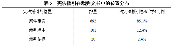 根据最高人民法院发布的《人民法院民事裁判文书制作规范》(法〔2016〕221号)(以下简称《制作规范》)的相关规定,裁判文书通常由标题、正文、落款三部分组成,其中正文是裁判文书的主体部分,包括首部、事实、理由、裁判依据、裁判主文和尾部等。通过检索2021年数据,裁判文书中的宪法援引分布在事实、理由以及裁判依据三个部分,分布情况如表2所示: