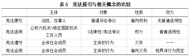 鉴于宪法援引在主体、对象、性质和效力等方面与宪法适用、宪法遵守和宪法运用等概念存在显著区别(如表5所示),如果简单地将宪法援引归属其中,就会失去学术的严谨性。确定宪法援引的学理属性应秉持严谨的学术立场,综合考量全部结构性要素,切忌以偏概全。