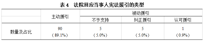 从宪法援引目的看,司法实践中法院的依宪说理分为主动型和被动型。主动依宪说理是指法院根据案件裁判需要,在当事人未提及宪法的情况下,或为解决法规范适用冲突与漏洞,或为基本权利提供权源基础,主动在裁判说理部分援引宪法,形成贯通一致的法律适用逻辑。被动依宪说理是指法院在当事人或者前审法院已经援引宪法的前提下,为回应当事人或者前审法院而援引宪法。法院的回应类型分为不予支持、纠正援引、认可援引三种。其一,不予支持是指法院在裁判理由部分回应当事人宪法援引,认为涉案行为不违反宪法,对相关主张不予支持。这是法院根据宪法与案件的关联性,针对当事人宪法援引目的做出的有效回应。其二,纠正援引体现为法院在裁判文书中告知当事人宪法不能作为裁判依据或者适用宪法错误,也会就前审法院的宪法援引行为做出评价或纠正偏误。其三,认可援引是指当事人在诉辩理由中援引宪法且诉辩请求获得了支持,同时法院对当事人的宪法援引做出回应,是对当事人宪法援引的一种认可。2021年度涉及法院依宪说理的案件共101例,其中90例为法院主动援引宪法,11例为法院被动援引宪法,具体数据如表4所示。