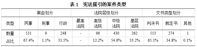 按照案由、法院层级、文书类型进行划分,宪法援引案件的数量及比例如表1所示: