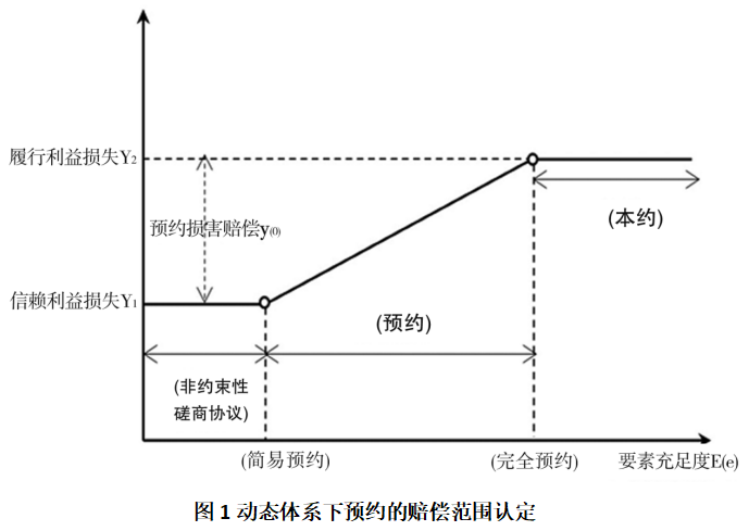 诚然,基于本文所拟设模型的评价范式可为预约损害赔偿范围认定建构较为直观的坐标参照图系,但考虑到横坐标上充足度E(e)存在着不计其数的坐标点,亦将对应不同程度的预约状态所认定的赔偿数值,因此,如何以更为精准和覆盖更加全面的方式实现对预约制度探索有待持续探讨和研究。沿循动态思维进路下,可实现对预约制度的弹性化构造,从规范解释视角对现下问题分析给予方法论回应,但是动态体系论并非司法适用理论的终点,动态思维只是对传统逻辑推演的大前提予以模糊化,为“要件—效果”的推演提供新的路径。但不可否认的是,该路径对其注入灵活的评价思维和理念范式,亦可有效在预约制度的利益冲突缓和及价值判断过程中,为其塑构新的理论模型。