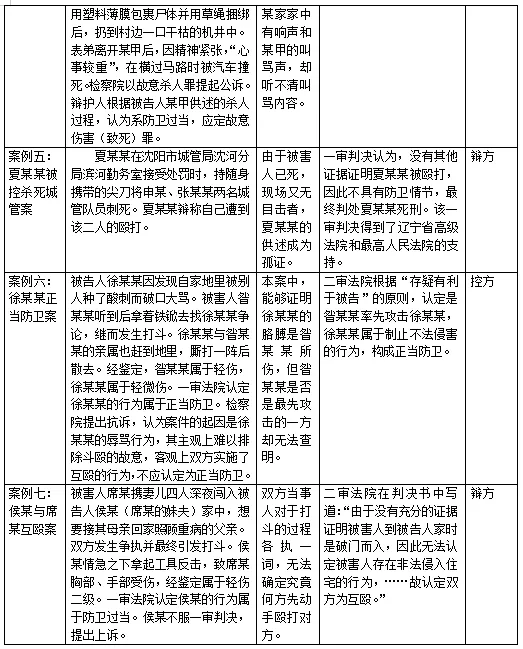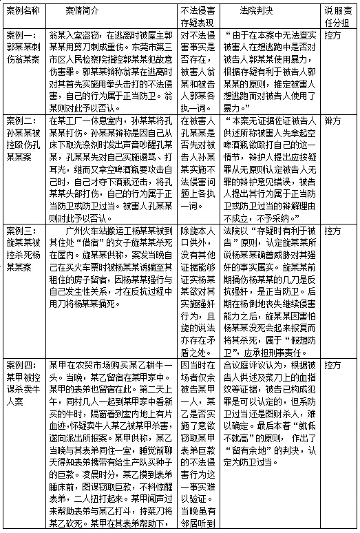第二,在被害人业已死亡,仅有被告人一面之词的案例中,既有肯定不法侵害存在的判决,如案例三、案例四;也有否定不法侵害事实存在的判决,如案例五。