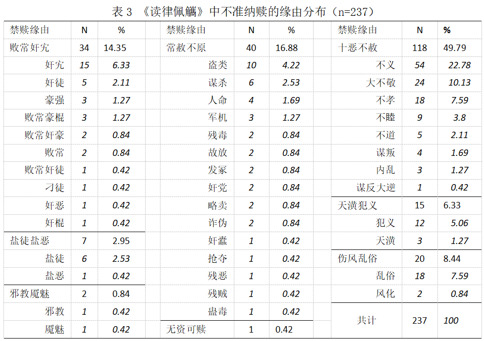 表3为禁赎条款中禁赎缘由的分布情况。所有缘由中排名前三的分别是十恶不赦、常赦不原和败常奸宄,其次是以具体行为作为理由的天潢犯义、伤风乱俗、盐徒盐恶和邪教魇魅,最后才是与资产相关的无资可赎。十恶不赦和常赦不原皆为清律名例律中法定罪名,而其他禁赎缘由则是王明德在详查律意的基础上“揣拟”给出。关于禁赎缘由,主要发现如下:
