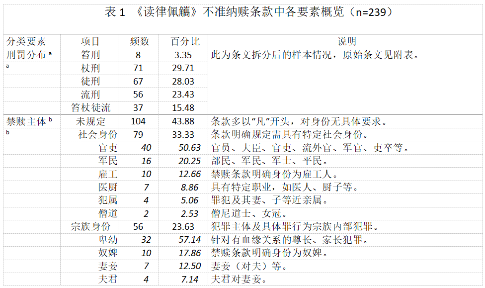 研究团队在王明德的基础上,对禁赎条款作进一步优化。一方面在转录过程中,将冗余信息剔除,并结合清律将缺损信息加以补全。另一方面以犯罪主体为依据,对这些条款进一步拆分,最后得出239项禁赎条款(实际分析237项,因两款不涉及主体身份、犯罪、事由,即,“重凶遇热审,请旨减等发落。系免死重囚,流、杖俱应不准赎”和“监候重囚,朝审矜疑,请旨发落者。系免死重囚,流、杖俱应不准赎” ,故后文分析过程中予以排除)。借助先前研究经验,研究团队将拆分后的禁赎条款根据一定的编码转录。