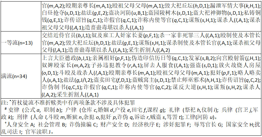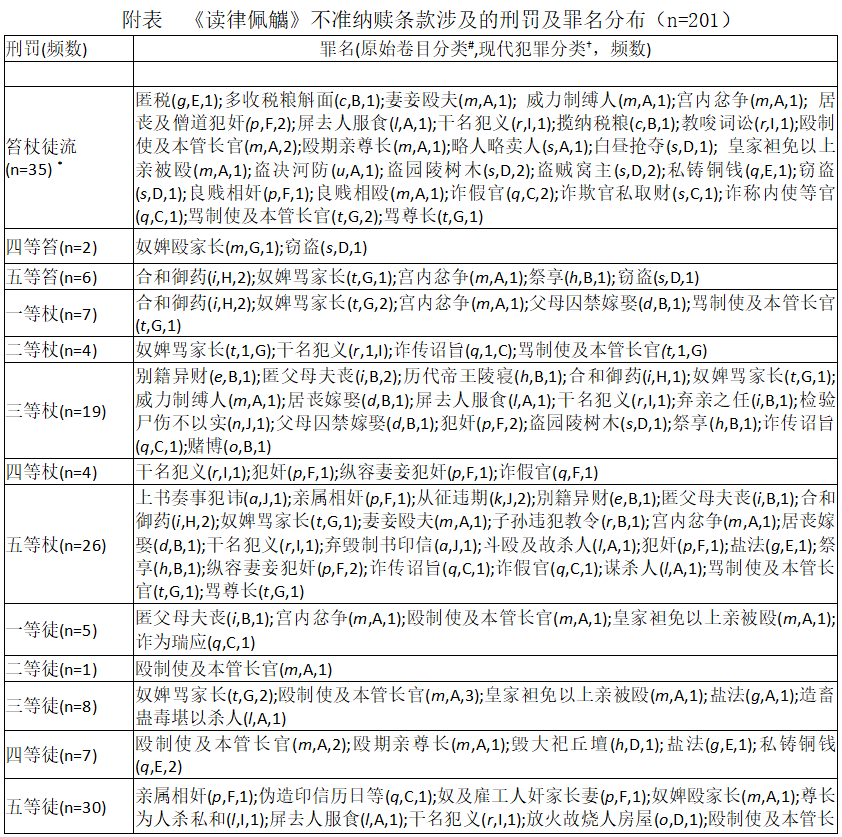 本研究团队选择由何勤华、程维荣等人点校,法律出版社2001年出版的《读律佩觿》为研究素材,共载禁赎条款201条。需要说明的是,这些禁赎条款虽然经过王明德的初步拆分,但受当时技术限制,仍有些许疏漏之处。一是,部分适用于死刑减等人犯的条款,不涉及具体犯罪;二是,一些条款后的禁赎缘由并不具体,而是只用“律不准赎”予以标示;三是,部分条款的信息并不全面,细节缺损较多;四是,条款拆分不够完善,王明德遵循“一事一语”方式,只以卷目中的犯罪行为为中心,将禁赎条款按刑罚分等拆分(详见附表)。