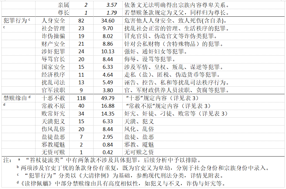 考虑到禁赎条款分布较广,且内容规定涉及罪、人、罚等复杂情事。研究团队在转录过程中,根据主题和研究需要,对拆分后的条款从以下三个方面进行了信息整合(详见表1)。一是禁赎主体,根据法条规定和先前的争议焦点,将禁赎主体分为无身份要求、社会身份和宗族身份三类。二是犯罪行为,禁赎条款相关罪行涉及74项罪名,难以逐一罗列。因此,研究团队参考先前的研究,按照现代刑法的分类标准对各类犯罪行为重新归纳。三是禁赎缘由,虽然多数禁赎条款后标示了相应缘由,但诸多缘由较为细碎杂乱,且部分缘由标注不清。研究团队将原始缘由结合律意进行整合后,共得出十恶不赦、常赦不原、败常奸宄、天潢犯义等八种禁赎缘由。