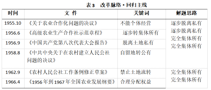 1955年秋至1956年夏,中国共产党开始思考如何使农村土地产权归属与最初的生产资料公有制的方向相契合。于是,1955年开始在《关于农业合作化问题的决议》中提出要改变原有的“个体经营的方式”,通过经营权的集中实现集体劳动。次年6月的《高级农业生产合作社示范章程》延续该思路,要求将农民私有的土地逐渐转为“合作社集体所有”。