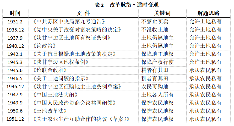 通过79份与农村土地产权改革有关的文件,可知中国共产党在研究与解决农村土地产权问题的过程中始终围绕着“权利归属”与“物尽其用”的命题进行思考与探索。从“农村土地的所有权应当归谁所有”到“农村土地的使用权应当归谁所有”,从“农村土地的占有与使用方式”到“农村土地的收益与处分方式”,中国共产党对农村土地产权改革问题的解答脉络分明。