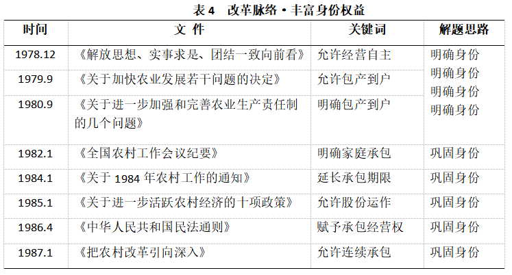1978年冬至1980年秋,中国共产党通过4份文件逐步明确了农村土地使用权的基础政策。在党的十一届三中全会提出要赋予农民“经营自主权”后,从《关于加快农业发展若干问题的决定(草案)》中的“不许包产到户”,到十一届四中全会上的允许“包产到户”,再到《关于进一步加强和完善农业生产责任制的几个问题》中的明确采取“包产到户”,可以感受到经过慎重考量后,党通过“包产到户”的产权政策明确了农民的身份权益。