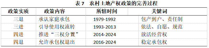进阶的“进”与“退”发生于1978年至2024年期间,对应着中国共产党对于升级命题的解题:通过理性的“进”与“退”,以及带有探索色彩的权能分离解决了农村土地产权的权能配置问题,起到了指明农村土地产权政策的改革方向,凸显时代性与现代性的作用。