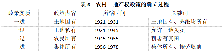 最初的“两进两退”发生于1921年至1978年期间,对应着中国共产党对于基础命题的解题:通过适时的进与退,以及带有试验色彩的权能分离,中国共产党解决了农村土地所有权的归属问题,起到了为农村土地产权政策体系定基调的作用。