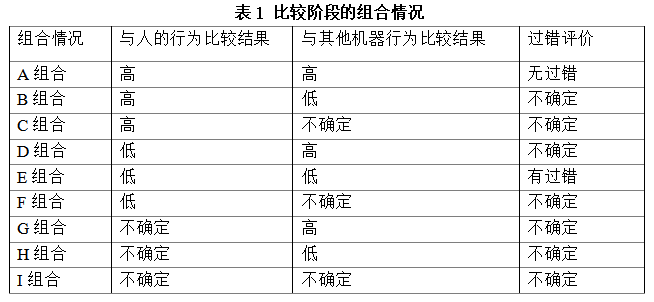 在比较阶段,机器行为与人的行为相比较,有可能产生以下三种结果:高于人类行为(>=)、低于人类行为(<)或者不确定。同样,与其他机器行为相比较,也有可能产生以下三种结果:高于其他机器行为(>=)、低于其他机器行为(<)或者不确定。因此,混合比较的结果共有C31×C31=9种组合情况。其中只有A、E组合能够得出准确的过错评价结果,如表1。