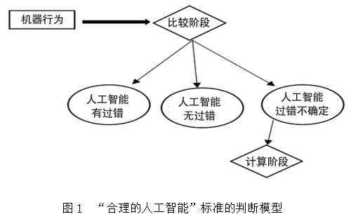 上述两种情形表明,采用一元评估对象的结论不仅相互矛盾,而且都脱离了一般意义上的法正义观。以单一指标(人类行为或者机器行为)作为依据,根本无法得出人工智能是否具有过错的正当性结论。由此,不妨设置一种更为动态、灵活的评估方法,同时将人类行为、其他机器行为设为比照对象,尝试搭建违反“合理的人工智能”标准的判断模型(见图1)。此判断模型区分为以下两个递进阶段:一是比较阶段。在比较阶段,应当将机器行为与人的行为、其他机器行为依次进行比较,如果通过比较就能够确定过错与否,则不再进入下一阶段。二是计算阶段。只有在上一阶段无法判定过错的情形,才需要进入计算阶段。