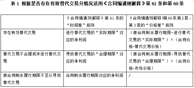 在违约方预期不履行合同情况下,如果替代交易开始履行的“实际期限”或“合理期限”与原合同停止履行的时点重合,那么就不存在两次给付的“时间差”,也无需适用继续性合同可得利益计算的特殊规则。具体而言,在期前拒绝履行的场合,违约方声明将在一定期限后停止履行合同,如果非违约方在该期限到来前已经安排了替代交易,并且替代交易在违约方停止履行时立即开始履行,或者法院认定违约方作出声明到实际停止履行的期限足以使非违约方安排上述替代交易,那么非违约方就不存在两次给付“时间差”造成的损失,也不存在《合同编通则解释》第61条的适用问题。