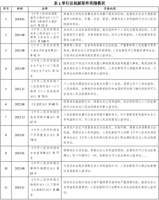 法律是检察行政公益诉讼运行的主要依据。2017年《行政诉讼法》第25条关于生态环境和资源保护、食品药品安全、国有财产保护、国有土地使用权出让等四个领域的规定可以看作是检察行政公益诉讼案件范围最初的立法样态,尔后通过各单行法确定的案件范围便是新拓展的成果。这些新拓展的领域主要包括英雄烈士保护、未成年人保护、军人权益保护、安全生产、个人信息保护、反电信网络诈骗、农产品质量安全、妇女权益保障、无障碍环境建设、文物保护等。2022年《中华人民共和国反垄断法》(以下简称《反垄断法》)将反垄断领域纳入检察公益诉讼案件范围,但明确规定适用民事公益诉讼,排除了检察行政公益诉讼的可能性。其他单行法,有的明确规定检察机关可以提起行政公益诉讼,有的即使没有明确,但也没有排除适用的可能性。为便于梳理案件范围拓展的脉络和分析具体拓展情况,本文以拓展时间为序制作下表。