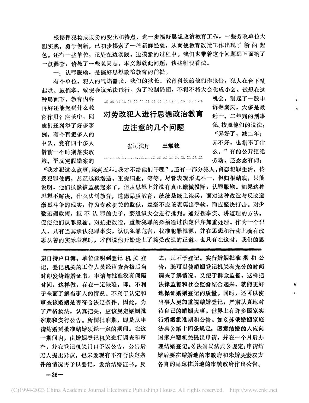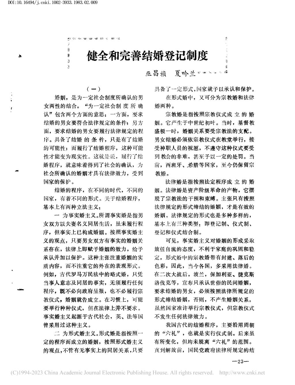 二位教授曾在《河北法学》1983年第2期发表文章《健全和完善结婚登记制度》,现重新推送此文以表纪念,共寄哀思。