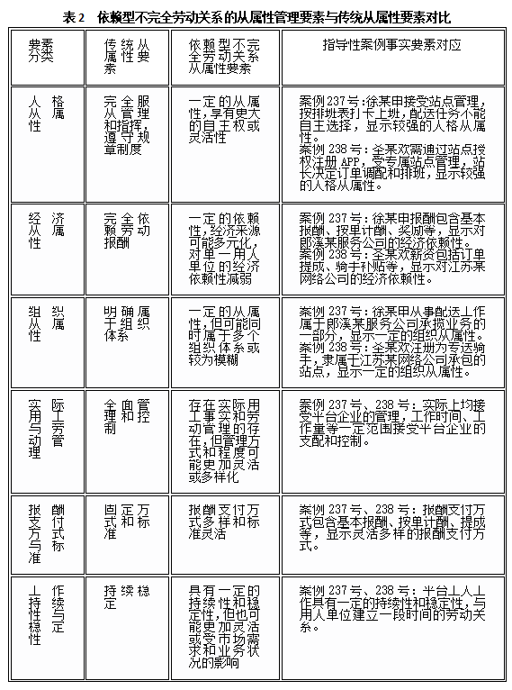 在传统劳动关系中,劳动者与用人单位之间存在着鲜明的从属性特征。基于这种传统从属性特征,劳动法构建了一套全面且严密的保障框架,旨在保护劳动者的各项权益,涵盖工资支付保障、工作时间规定、休息休假制度、劳动安全卫生保障以及社会保险制度等多个方面。为了更清晰地展示依赖型不完全劳动关系与传统从属性劳动关系之间的差异,笔者将“指导性案例”带入两者从属性管理要素对比表格(表2)中,针对这些指导性案例是否契合传统从属性的各项事实要素进行对应性分析。