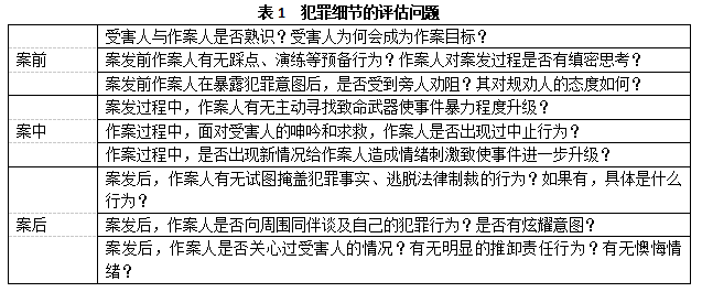 第三,犯罪过程和事后表现对于判断个体的共情能力有重要意义,比如犯罪过程时间较长且存在明显的侮辱和折磨行为,受害人的服从乞怜没有减少作案人的暴力程度,在受害人已明言犯罪行为的直接不利后果后,仍不能阻止犯罪行为发生,表明作案人的共情能力极低。此外,事后是否对犯罪进行自我合理化、将责任推卸给受害人,同样是评价其危险性的指标。从行为科学的角度看,案前、案中、案后的犯罪行为决策表现对于判断行为人的危险程度均有重要参考价值,犯罪行为细节的探测性问题包括以下几项(见表1):