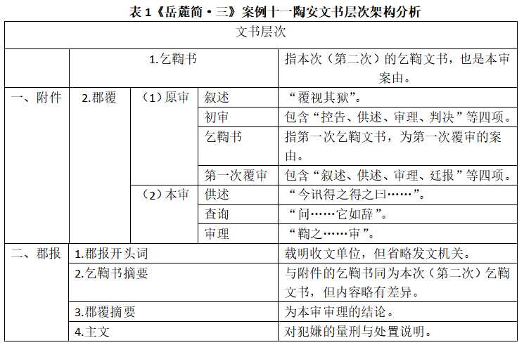 原审是覆审官吏对原审文书所作的审查,始于简文“覆视其狱”。原审下的初审包含控告、供述、审理、判决共四项;而第一次覆审包含叙述、供述、审理、廷报共四项。初审以控告为始,第一次覆审则以叙述作为开端,即简文“廷史赐等覆之”。以控告为起点较为符合文书/审理的程序,不过,第一个乞鞫文书应当是本审的案由,应列在郡覆之下,而不宜列在附件之下,与郡覆平行;第二份乞鞫文书则为第一次覆审的案由,应列在第一次覆审之下,而不宜列在原审之下,与初审及第一次覆审平行。对比本案两个“叙述”,第二个“叙述”列在“第一次覆审”之下,“廷史赐等覆之”仅能说是第一次覆审的负责人员,其案由应为第一次乞鞫书,应列第一次覆审之下;而第一个“叙述”列在“原审”之下,但“覆视其狱”应属“郡覆”的作为,当列在郡覆之下,否则,易被误解为原审官吏的作为。以《岳麓简·三》案例十一为例,由于是第二次覆审,故此次本审应当指第二次覆审;而原审则包含初审与第一次覆审。在《岳麓书院藏秦简·叁》附录一中,陶安将“覆视其狱”视为原审官吏的发语词,列在原审的叙述项。但“覆视其狱”表示的是对“故狱”即原审司法文书的检核程序,应为本审的发语词。“覆视其狱”与“今讯某”皆属本审官吏的作为,前者表示本审(即重审官吏)对“故狱”(原案文书)的查核,后者则为本审对相关涉案人展开正式的审讯工作。