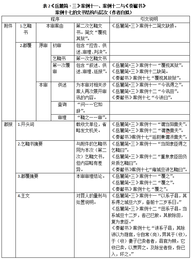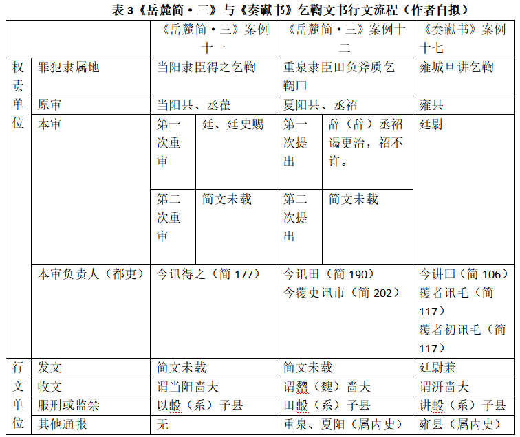 上述三个案例中,《岳麓简·三》案例十一是第二次乞鞫的重审文书,内容包含初审与第一次覆审的故狱文书。该案经历三次审理,其文书结构相对复杂。《岳麓简·三》案例十二仅有一次重审,无论是审理型态还是文书结构都简单得多。《奏谳书》案例十七则较为详尽地呈现出乞鞫程序的全过程。作为覆审乞鞫的下行文书,《岳麓简·三》案例十一、案例十二与《奏谳书》案例十七的文书结构具有一致性。三者案例进行对比分析,有助于我们把握此一时期的文书行政与审理形态的基本面貌,见表1。