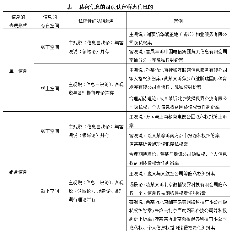 从表1所列的四种司法样态可以看出,在线下非网络空间中,单一信息与组合信息的认定标准是一致的,既需要满足主观说,也需要满足客观说。有学者将“主观说+客观说”这一并存的判断模式,解释为司法裁判的适用设置了私密性检验义务。
