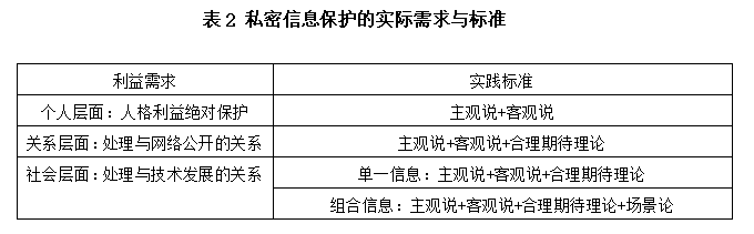 总之,我国实践中的认定标准,既强调了个人层面的保护,也关注到关系层面和社会层面的保护。不同认定标准的出现乃为了回应互联网、人工智能等技术发展对私密信息利益保护的新需求,乃努力填充人际关系交往层面和社会层面的利益保护(见表2)。具体来看,一是,从个人角度来看,如果某信息并未进入信息流动的场景之中,还只处于自己控制的范围之内,此时,受保护的利益需求只来自于个人。那么无论是线上还是线下,采主观说与客观说并存的标准,可以完成对个人人格利益的绝对保护。二是,从关系层面来看,如果某信息已经进入到信息流动的“部分人”场景之中,在线下空间该部分人可以较为清楚地知悉该信息是否保有秘密状态。此时,该信息是否可继续流动,以权利人的意愿为主并无不妥,采主观说与客观说并存的标准,可以完成对个人人格利益和他人言论自由的平衡保护。在线上空间,该部分人则未必清楚地知悉该信息是否保有秘密状态。此时,该信息是否可继续流动,完全以权利人的意愿为主,难以完成对个人人格利益和他人言论自由的平衡保护。在主观说与客观说并存的基础上,仍需判断合理期待理论,意在限缩权利人控制的私密信息范围。三是,从社会层面来看,如果某信息已经进入到信息流动的社会场景之中,信息则具有促进技术发展应用的社会需求。此时私密信息的保护范围不仅需受合理期待理论的限制,还要考虑与信息平台等技术主体之间的利益平衡,根据实际情况适用场景论。