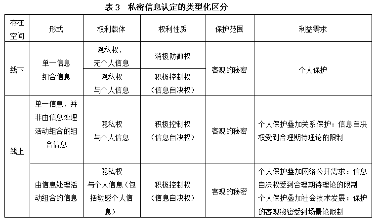 三是若某私密信息存在线上的网络空间,只能以电子或其他方式记录,无论是否独立存在,则不仅受隐私权保护,还受个人信息保护,需额外叠加积极控制需求的主观说。此外,对该信息的保护需平衡个人的主观意愿与网络公开性的关系,还需额外叠加合理期待理论。共需满足三个方面的判断,即客观说、主观说、合理期待理论。