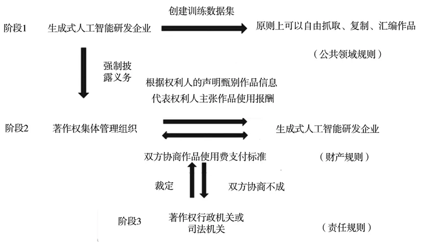 从性质上讲,上述以“事后保留”为核心的“选择退出”规制模式在制度构造上更接近于学者所谓的“转换规则”。具体而言,生成式人工智能研发企业在创建作品训练数据集的过程中可能会受到著作权法的“三阶”规制。在“一阶”规制阶段,立法应以公共领域规则作为规制生成式人工智能数据训练行为的逻辑起点,原则上赋予人工智能研发企业为创建训练数据集可无偿抓取、复制、汇编他人作品的自由,但同时也应为其设定强制公开训练信息的义务,以便于相关作品著作权人能够及时知悉作品使用情况,并自由决定是否退出公共领域规则的适用。在“二阶”规制阶段,若著作权人拒绝适用公共领域规则,此时权利人有义务将选择退出决定及时告知生成式人工智能研发企业,并由双方按照财产规则的要求协商确定作品的使用价格。在“三阶”规制阶段,若双方难以就使用价格达成协议,应当根据责任规则的要求将报酬的支付标准问题交由司法机关或著作权行政主管机关裁定,并由生成式人工智能企业按照裁定结果履行报酬支付义务。(见图1)