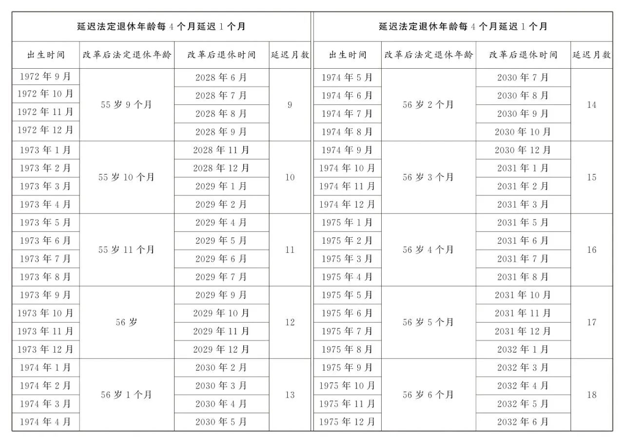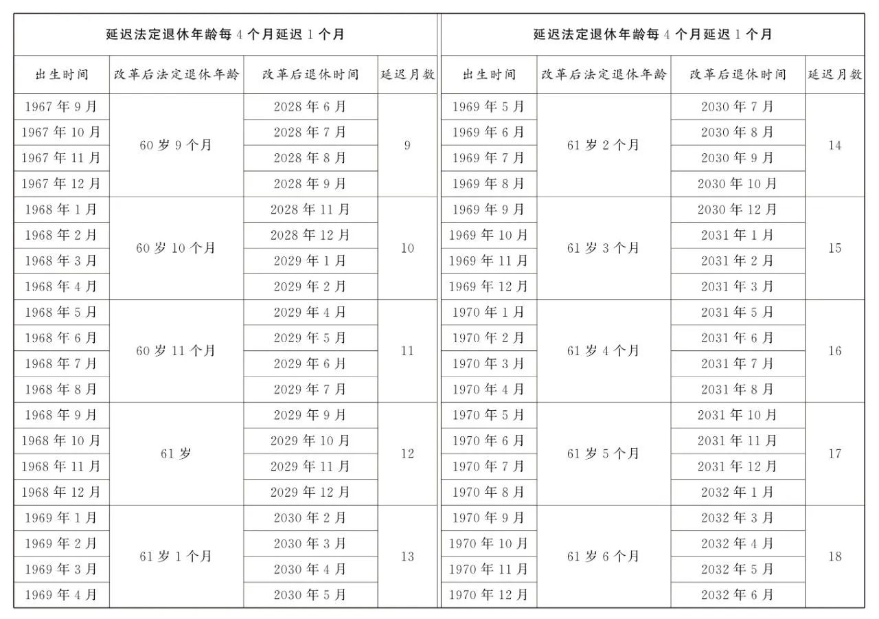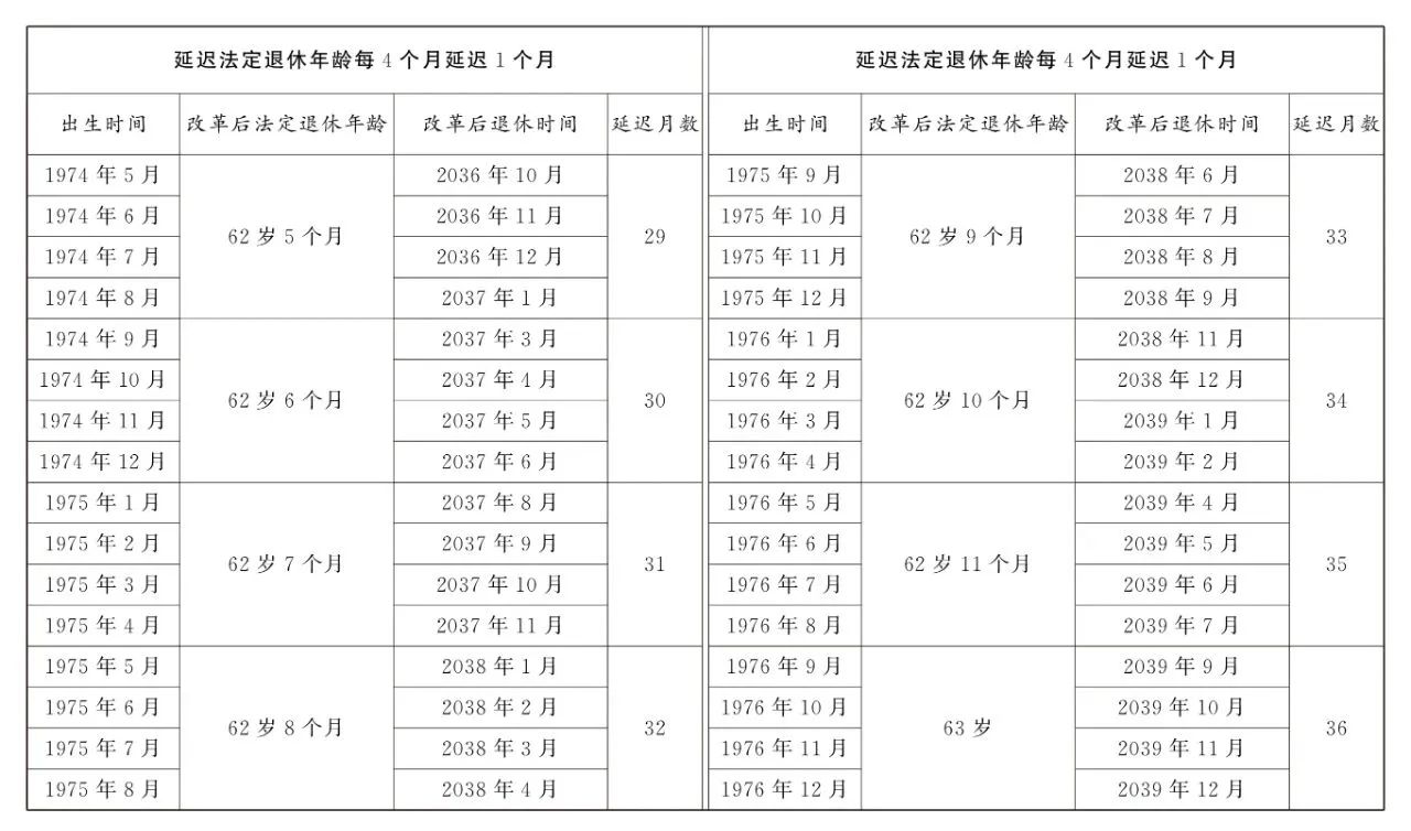 第一条 从2025年1月1日起,男职工和原法定退休年龄为五十五周岁的女职工,法定退休年龄每四个月延迟一个月,分别逐步延迟至六十三周岁和五十八周岁;原法定退休年龄为五十周岁的女职工,法定退休年龄每二个月延迟一个月,逐步延迟至五十五周岁。国家另有规定的,从其规定。