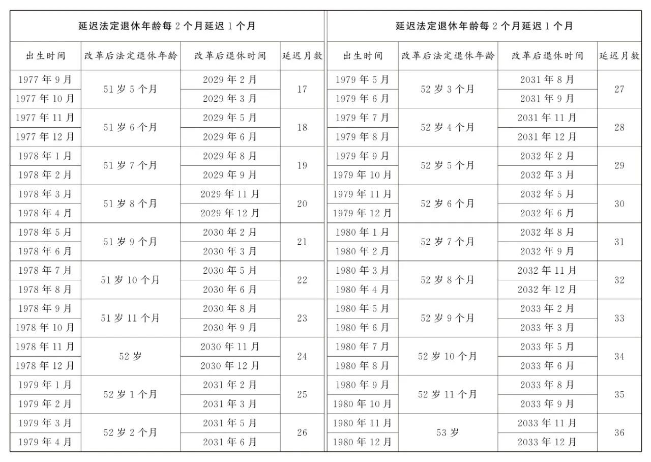 1.男职工延迟法定退休年龄对照表