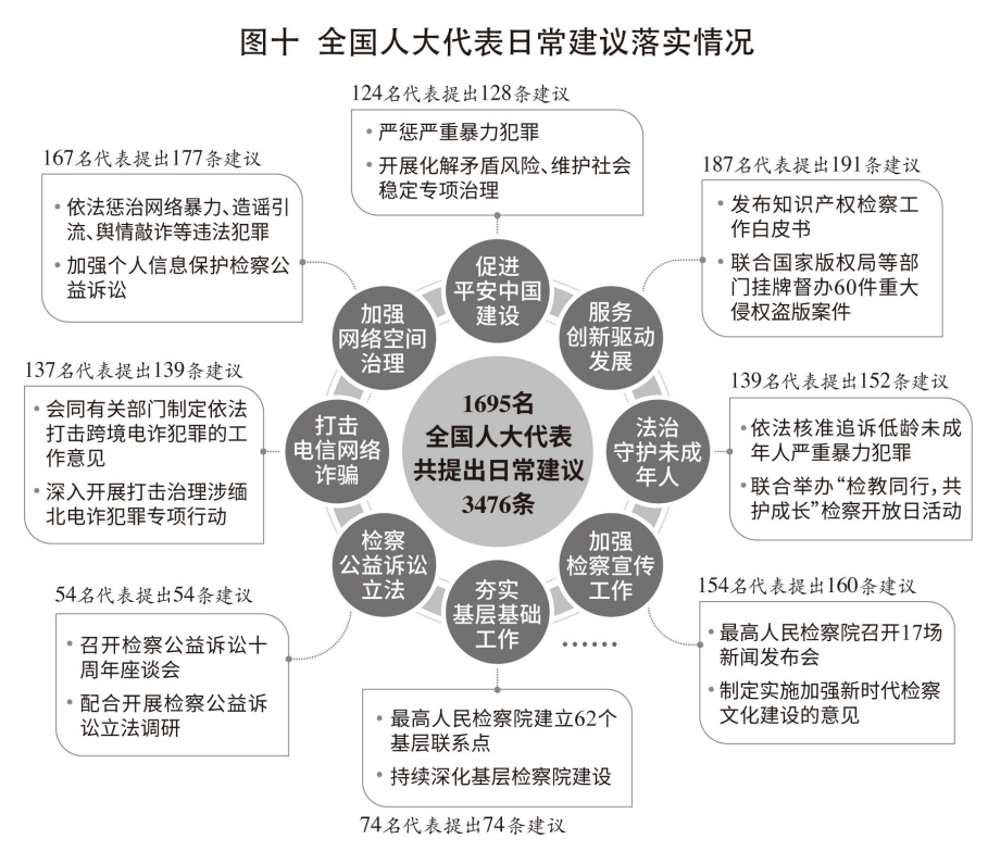 自觉接受人大监督。专题部署贯彻十四届全国人大二次会议精神。向全国人大常委会专项报告行政检察工作,认真落实审议意见。邀请全国人大代表视察检察工作、参与检察活动1720人次。走访2243名全国人大代表,当面征求意见。认真办理全国人大代表建议214件,答复落实全国人大代表审议报告、调研座谈时提出的意见建议3476条。