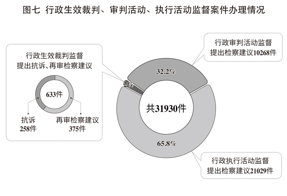 做实行政检察监督。会同最高人民法院制定规范办理行政再审检察建议案件的意见,对认为确有错误的行政生效裁判提出抗诉和再审检察建议633件,法院审结422件,其中改判、发回重审、调解及和解撤诉占84.8%。对行政审判和执行活动违法情形提出纠正意见3.1万件,采纳率99.1%。制定在履行行政诉讼监督职责中开展行政违法行为监督的意见,依法提出检察建议1.7万件。推动行政处罚和刑事处罚双向衔接,依法督促行政执法机关移送涉嫌犯罪案件2964件,防止以罚代刑;对被不起诉人应受行政处罚的提出检察意见16.02万人,防止当罚不罚。