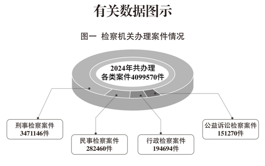 2024年,在以习近平同志为核心的党中央坚强领导下,在全国人大及其常委会有力监督下,最高人民检察院坚持以习近平新时代中国特色社会主义思想为指导,深入学习贯彻习近平法治思想,全面贯彻党的二十大和二十届二中、三中全会精神,认真落实十四届全国人大二次会议决议,深刻领悟“两个确立”的决定性意义,增强“四个意识”、坚定“四个自信”、做到“两个维护”。坚持党对检察工作的绝对领导,党和国家中心工作推动到哪里,检察工作就跟进到哪里,践行全过程人民民主,坚定不移走中国特色社会主义法治道路。紧紧围绕推进中国式现代化,忠实履行宪法法律赋予的法律监督职责,为大局服务、为人民司法、为法治担当,严格公正司法,将高质效办好每一个案件、“努力让人民群众在每一个司法案件中感受到公平正义”作为新时代新征程检察履职办案的基本价值追求,持续推进习近平法治思想的检察实践,各项检察工作取得新成效。全国检察机关共办理各类案件409.96万件,其中最高人民检察院办理8980件,同比分别下降3.6%和上升9.4%。