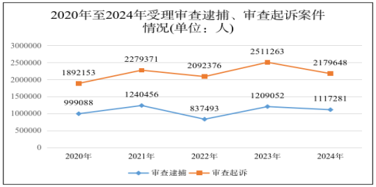 1. 刑事案件受理数量有所下降。2024年,全国检察机关共受理审查逮捕各类犯罪781919件1117281人,同比分别下降5.7%、7.6%;审查后共批准和决定逮捕752594人,同比上升3.6%。受理审查起诉各类犯罪1531209件2179648人,同比分别下降14.3%、13.2%;审查后决定起诉1630685人,同比下降3.4%。
