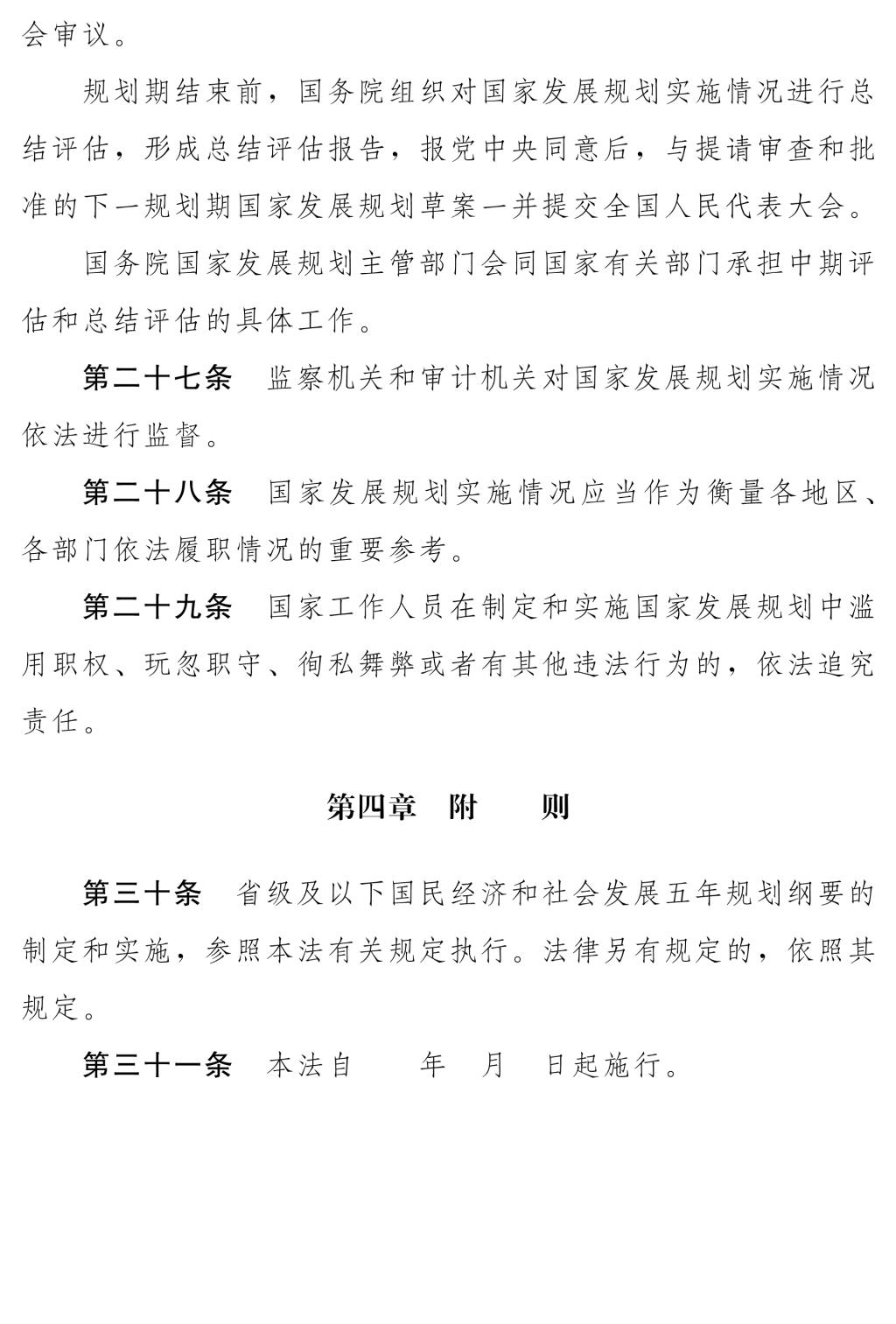 十四届全国人大常委会第十五次会议对《中华人民共和国国家发展规划法(草案)》进行了审议。现将《中华人民共和国国家发展规划法(草案)》公布,社会公众可以直接登录中国人大网(www.npc.gov.cn)或国家法律法规数据库(flk.npc.gov.cn)提出意见,也可以将意见寄送全国人大常委会法制工作委员会(北京市西城区前门西大街1号,邮编:100805。信封上请注明国家发展规划法草案征求意见)。征求意见期限为30日。