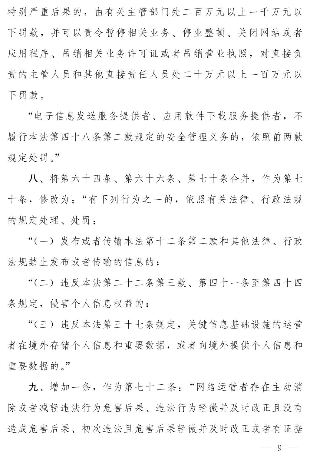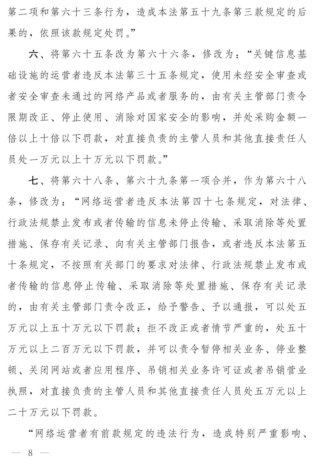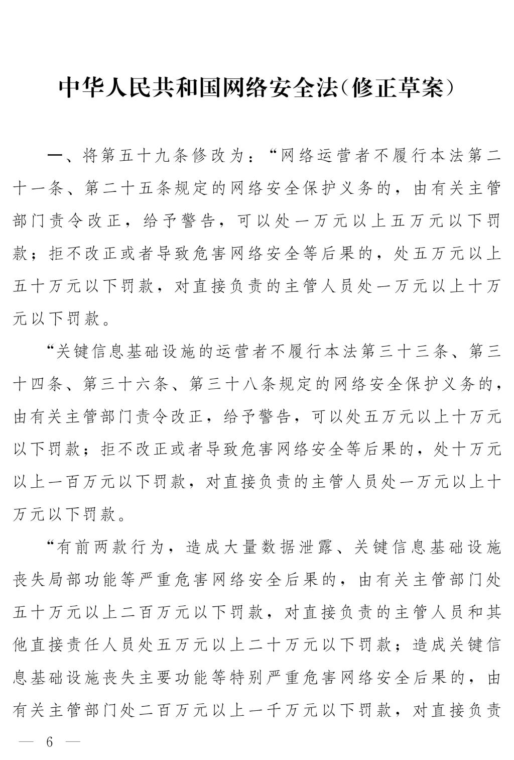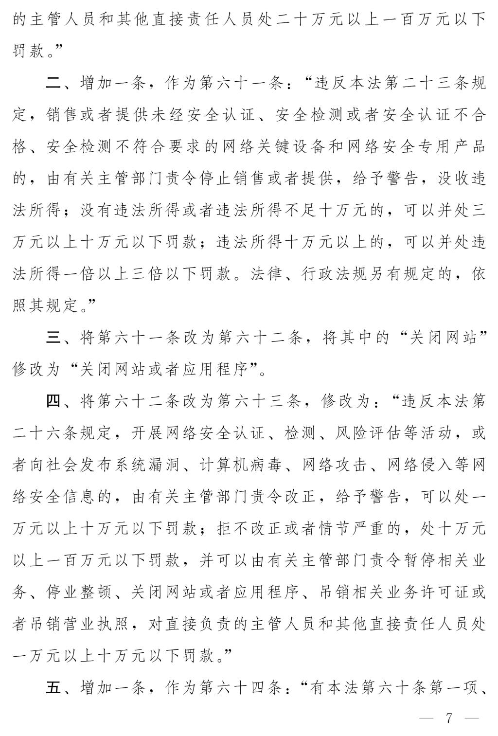 十四届全国人大常委会第十七次会议对《中华人民共和国网络安全法(修正草案)》进行了审议。现将《中华人民共和国网络安全法(修正草案)》公布,社会公众可以直接登录中国人大网(www.npc.gov.cn)或国家法律法规数据库(flk.npc.gov.cn)提出意见,也可以将意见寄送全国人大常委会法制工作委员会(北京市西城区前门西大街1号,邮编:100805。信封上请注明网络安全法修正草案征求意见)。征求意见期限为30日。