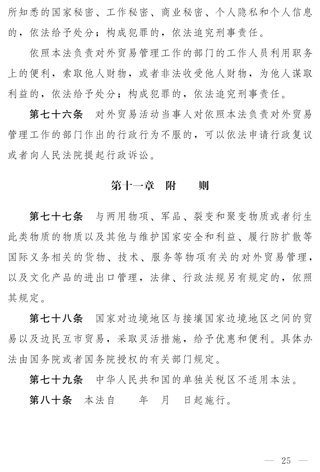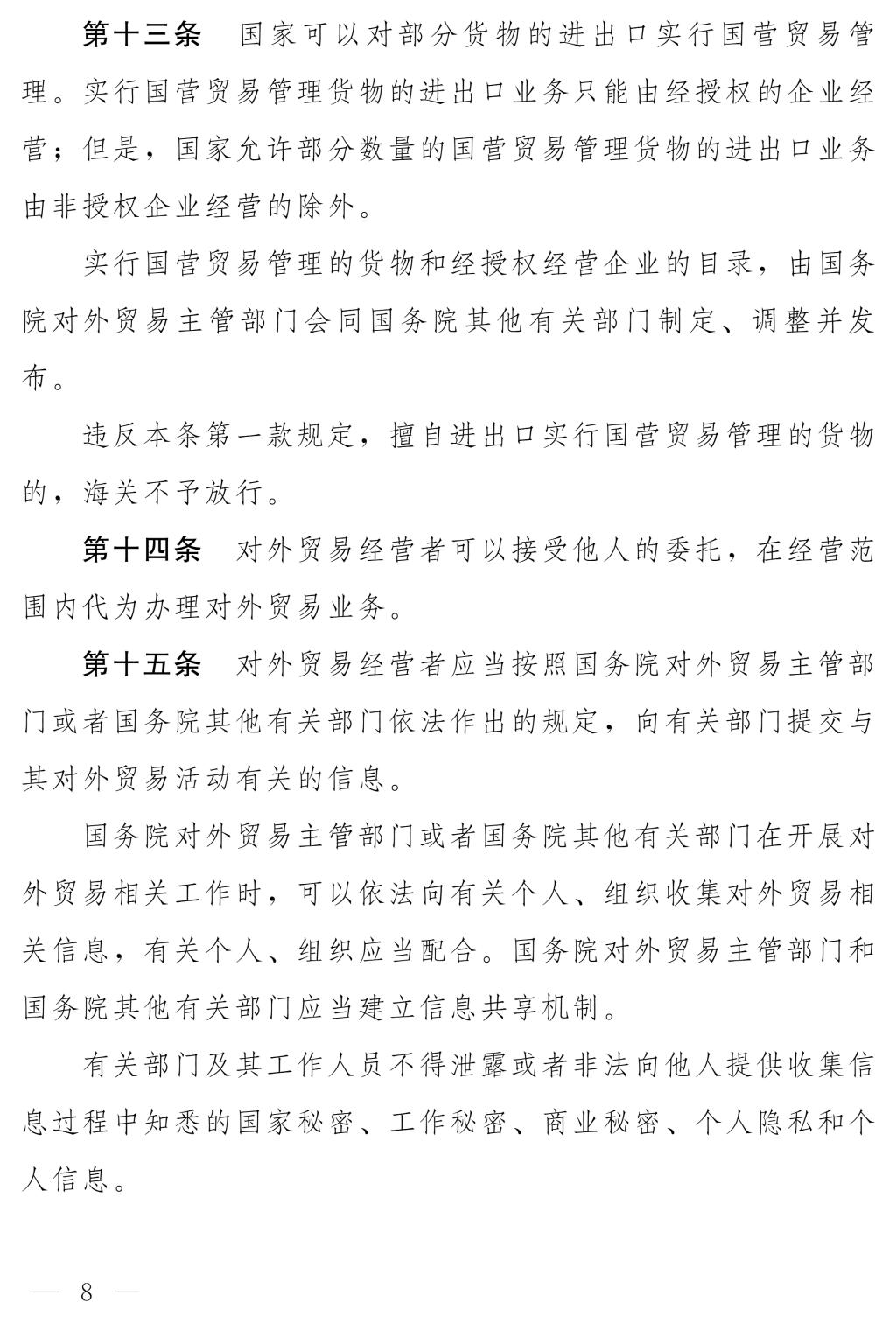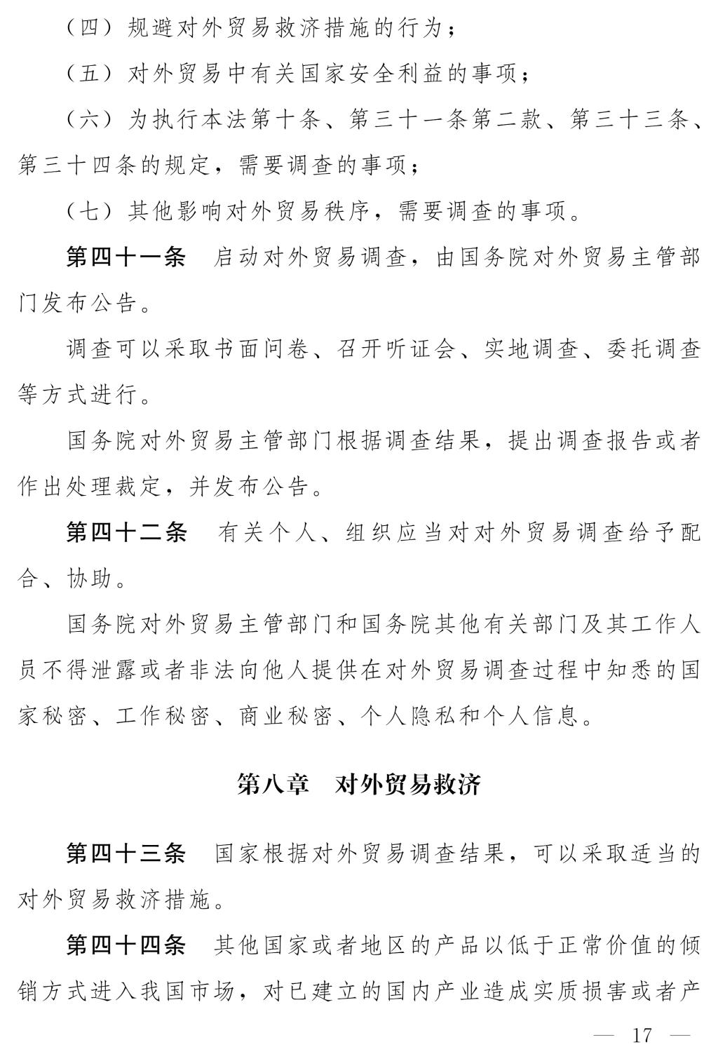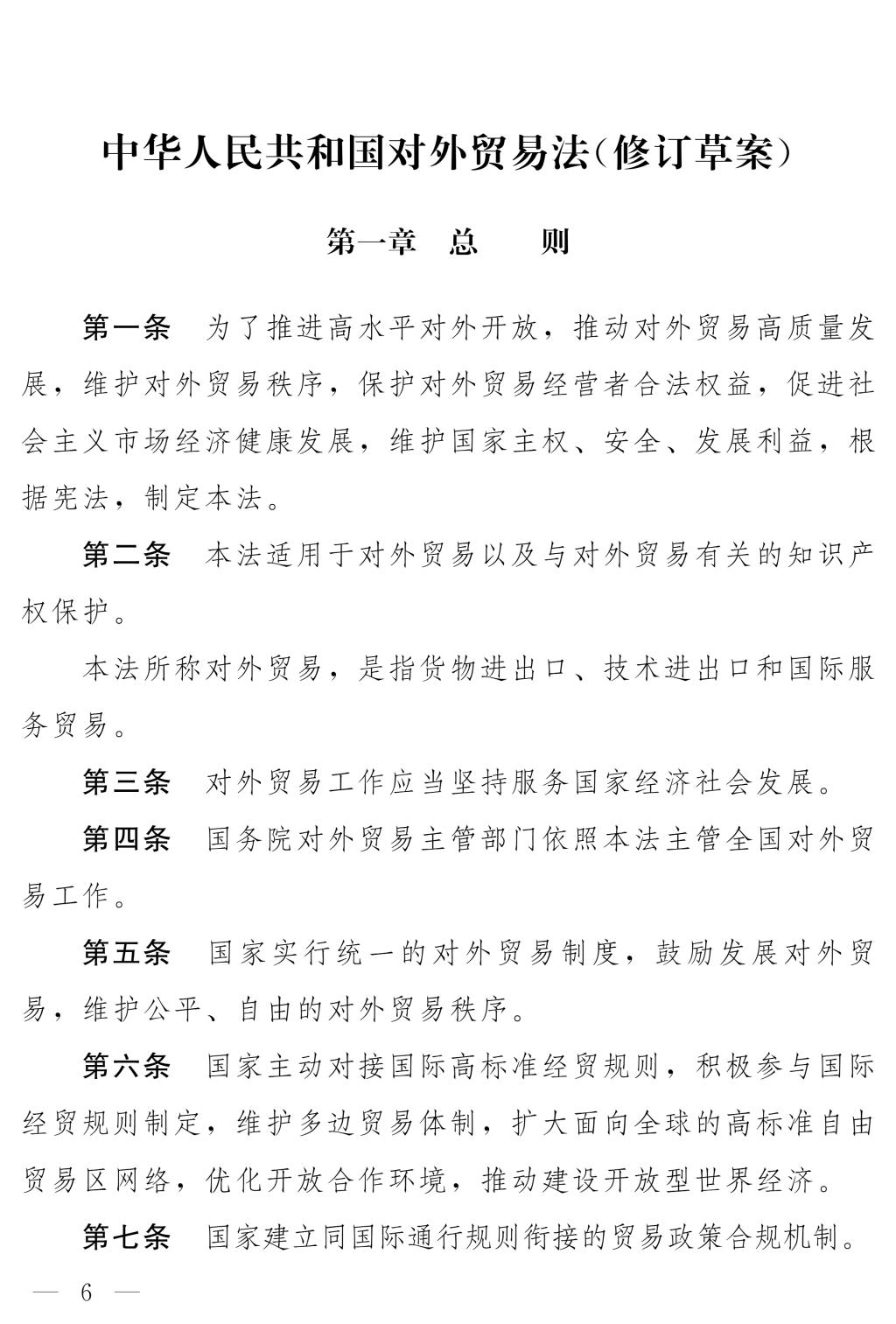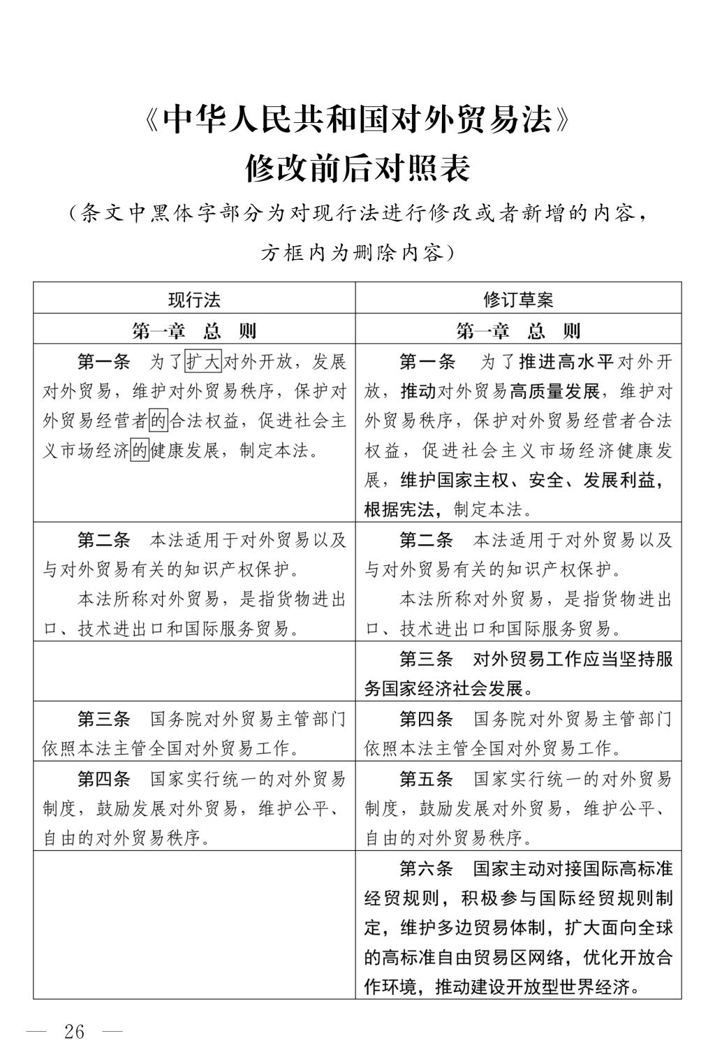 十四届全国人大常委会第十七次会议对《中华人民共和国对外贸易法(修订草案)》进行了审议。现将《中华人民共和国对外贸易法(修订草案)》公布,社会公众可以直接登录中国人大网(www.npc.gov.cn)或国家法律法规数据库(flk.npc.gov.cn)提出意见,也可以将意见寄送全国人大常委会法制工作委员会(北京市西城区前门西大街1号,邮编:100805。信封上请注明对外贸易法修订草案征求意见)。征求意见期限为30日。