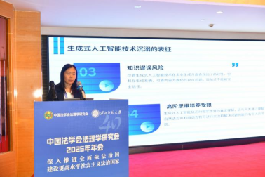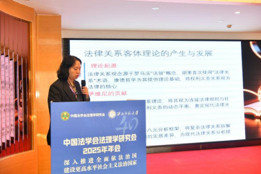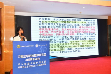杨昌宇教授的报告以中国自主法学知识体系构建为背景,认为该进程需以反思为前提,核心含两大环节:一是清点既有知识体系,厘清存量以定位知识进化梗阻点;二是将中国法治实践新成就转化为学理成果,她选取“法律体系概念重构”为议题,通过梳理国内研究发现其主要分为三个层面:建设完善层面聚焦实践构建,理论凝练层面侧重内涵提炼,知识转化层面需逻辑介入,属知识论范畴。她指出,法律体系概念具有“一体两面”属性:既含实践维度的法治制度体系,也包括理论维度的法学概念体系,二者不可割裂。当前重构法律体系概念面临三类症候:一是理论与实践存在张力,概念移植后遗症、多元理论杂糅及实践成果转化迟滞并存;二是认识论混淆,法学概念与日常用语的法律体系常被混用;三是移植性思维主导,缺乏本土资源挖掘与历史维度考量。最后,她担忧该概念难承研究重任,且参与数字法治交流后对新兴范畴存惑,并初步提出三维革新路径:本体论上挖掘本土资源,方法论上推动范式转型,认识论上厘清概念双维度边界。